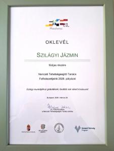 A rangos elismerésre hazai és határon túli tehetségpontok, Tehetségsegítő Tanácsok, valamint a Magyar Tehetségsegítő Szervezetek Szövetsége és a Nemzeti Tehetségsegítő Tanács tagszervezetei jelölhették a húsz évnél nem idősebb, kiemelkedően tehetséges fiatalokat. Jázmin jelölését a Baptista Tehetségsegítő Tanács támogatta. A díjat március 28-án Budapesten, a XVII. Kárpát-medencei Tehetségnap alkalmával Dr. Sulyok Tamástól, Magyarország köztársasági elnökétől vehette át.